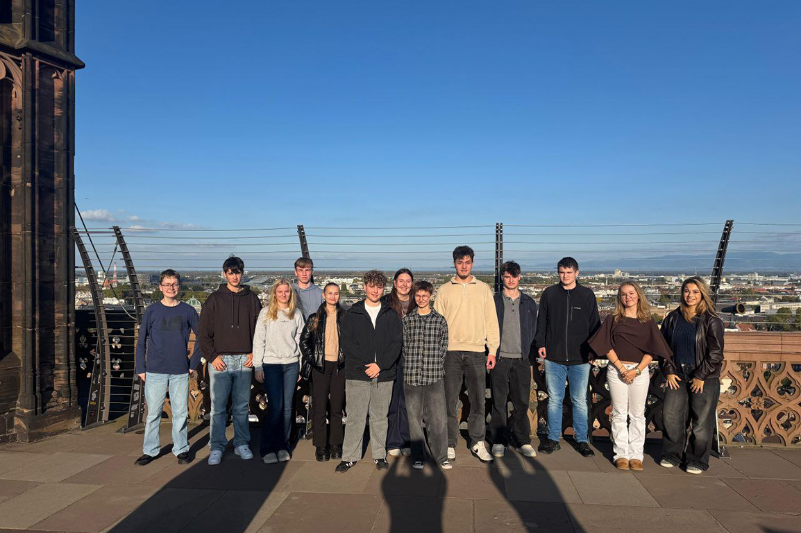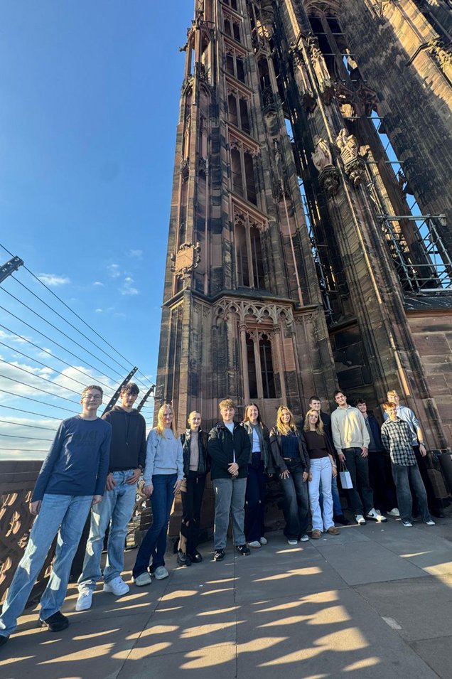 Zu den Hauptprogrammpunkten gehörten beispielsweise eine Schnitzeljagd durch das Europaviertel inklusive eines Besuches im beeindruckenden Europaparlament. Bei vergessenem Ausweis gestaltete sich der Einlass auch als Schülergruppe als durchaus schwierig und so musste auch schon mal der Organspendeausweis gezückt werden als letztes Mittel zur Identifikation. An einem anderen Tag wurden die 322 Stufen zur Aussichtsplattform des Straßburger Münsters erklommen, um bei schönem Wetter eine tolle Aussicht über die Innenstadt zu genießen. Ein authentischer Schulbesuch am Collège Notre-Dame de Sion war ebenfalls drin und unsere Schülerinnen und Schülern konnten den französischen Schulalltag einmal live miterleben. In der Schulkantine mittags gab es dann Würstchen und Sauerkraut für alle – Zufall, so sagte man uns. Weitere Programmpunkte waren eine Bootsrundfahrt durch die Kanäle der Innenstadt, eine Promenade im malerischen alten Gerberviertel „La Petite France“ sowie Museumsbesuche im historischen Museum und im Museum für moderne Kunst.