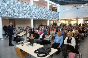Genau an diesem Punkt setzte der Impulsvortrag von Prof. Peter Schmieder von der Hochschule Deggendorf an. Er ist dort auf die Forschungsbereiche Konfliktmanagement und Wirtschaftsethik spezialisiert. Unter der Überschrift „Selbstorganisiert – aber dafür ohne Plan?“ bezog sich Prof. Schmieder auf die Frage nach dem Verhältnis der Lernpraxis an allgemeinbildenden Schulen zu den Anforderungen im Bereich Lernkompetenz an den Universitäten. Schmieder berichtete aus der eigenen Perspektive seiner Studienzeit über die Herausforderungen des Lernens in einer sich rasant verändernden Welt. Sein zentrales Statement lautet: „Wir müssen etwas tun.“ Als Beleg lieferte er Zahlen, nach denen 25 Prozent der Schulabgänger als nicht mehr berufsfähig, und zwischen zehn und fünfzehn Prozent der Gymnasiasten als nicht studierfähig gelten. Der Grund: Es fehle an Sozial- und Selbstkompetenzen – also an Fähigkeiten wie Selbstdisziplin, Organisation, Zielorientierung und Zeitmanagement.