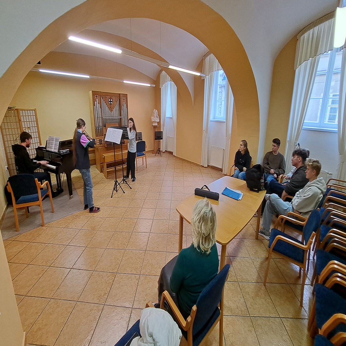 Begleitet wurden die Gäste aus Niederalteich höchst umsichtig und gastfreundlich von der Schulleiterin Nikola Sklenářová und ihrer Stellvertreterin Eva Bohuslavová. Eindrucksvoll war die Begegnung mit dem Mitglied des Schulleitungsteams Herrn Zdeněk Kapl, der im Theater in der Rolle der Hexe Baba Yaga und in Carmen als Zuniga zu erleben war. Mit dem Pianisten Luca Gualco schließlich verbrachte die Gruppe einen überaus geselligen Abend mit italienischen Spaghetti, die der Meister selbst zubereitete. In der abschließenden Runde mit dem Leitungsteam des Konzervators wurde vereinbart, dass mit einer Abordnung von Studentinnen und Studenten aus Opava ein Gegenbesuch in Niederalteich erfolgen soll.