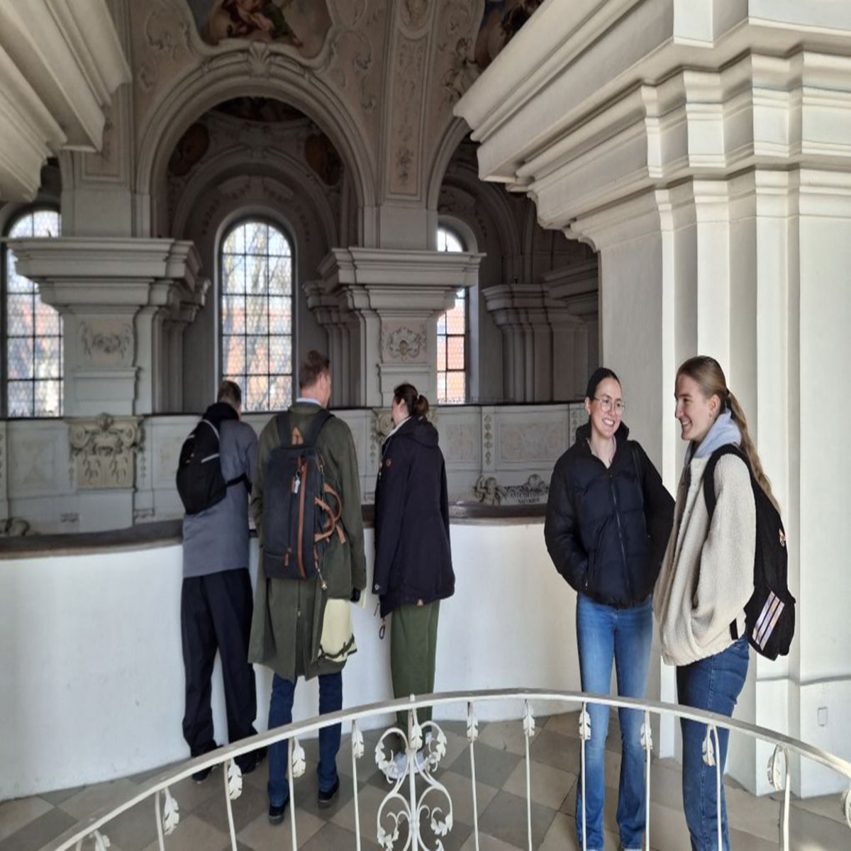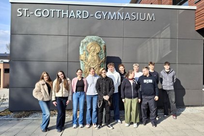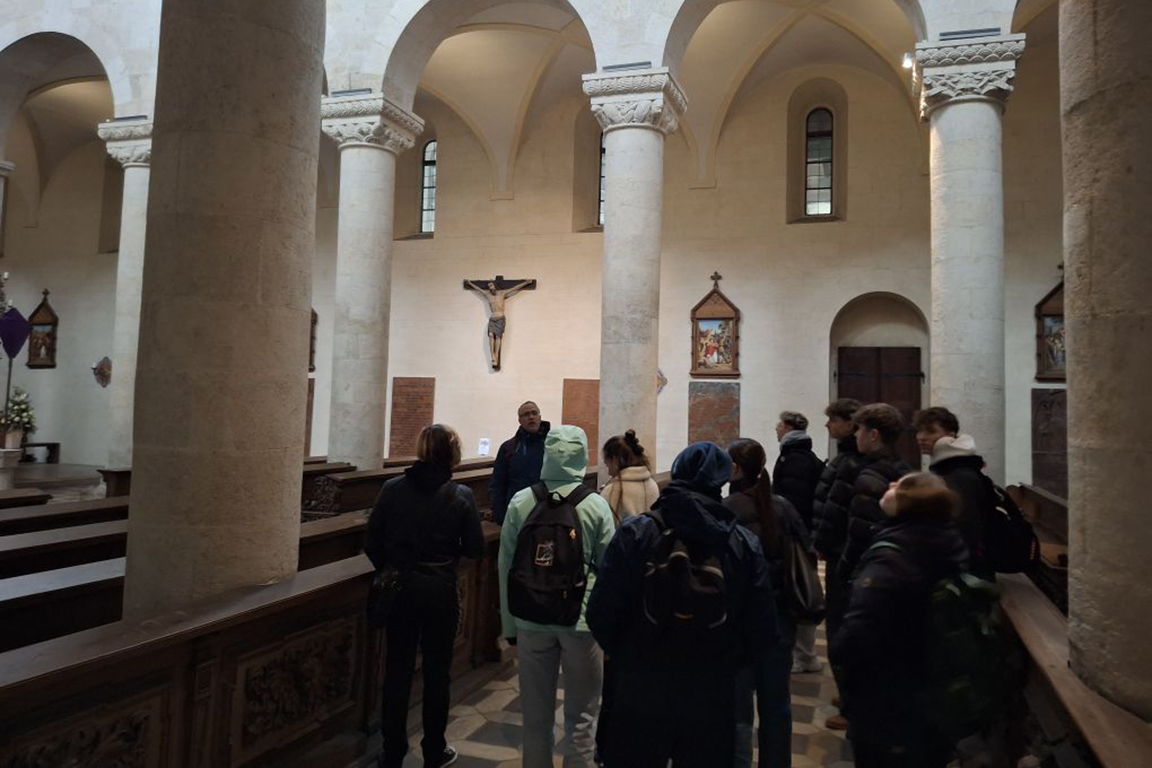 Am Montagmorgen hieß Herr Lummer unsere Gäste willkommen und gab ihnen den „Arbeitsauftrag“, bis zu ihrer Abreise mindestens fünf bayerische Ausdrücke zu erlernen. Im Anschluss erhielten sie eine Führung durch die Schulgebäude und die Sportanlagen, bevor sie ihr erstes Mittagessen in der Mensa des SGG einnahmen. Frisch gestärkt ging es nachmittags auf eine interessante und informative Führung durch die Basilika mit Herrn Raabe, der anhand der Bilder und Symbole die Geschichte unserer wunderbaren Basilika lebendig darzustellen vermochte.