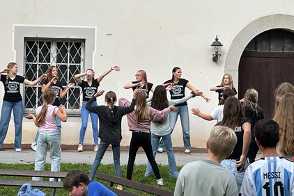 Der Tag begann wie jeder normale Schultag, aber in der 7. Stunde kamen die jeweiligen Tutorinnen in die Klasse und machten die Schüler mit den Regeln der darauffolgenden Schulhausrallye bekannt. Die Kinder bildeten eigenständig 2-3 Teams und die Schulhausrallye konnte beginnen. Mit viel Freude stürmten die Fünftklässler los in den Neubau, beantworteten tapfer alle Fragen und baten andere Schüler oder Lehrer um Rat. Als alle Teams fertig waren, wurde eine Musikbox im Klosterinnenhof aufgestellt und die Schüler tanzten und sangen mit viel Freude zu den Liedern.