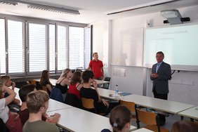 Herr Hösl, Lehrkraft des Wahlunterrichtes Politik, hieß den politischen Besuch zunächst noch einmal an der Schule herzlich willkommen und übergab dann das Wort an Simon Golombek. Dieser stellte mithilfe einer Powerpoint-Präsenation den Politiker Barthl Kalb (CSU) und dessen Werdegang dem Publikum kurz vor: in seinem Wohnort Künzing wurde er als zweitjüngster sehr früh in den Künzinger Gemeinderat gewählt und gehört diesem seither seit mehr als 40 Jahren an. Sehr früh schaffte er zudem den Sprung in den Bayerischen Landtag und schlussendlich im Jahr 1987 den Sprung in den Deutschen Bundestag als Direktabgeordneter des Wahlkreises Deggendorf. Gleichzeitig vergaß er während seiner bis zum Jahre 2017, indem er nicht erneut kandidierte, andauernden Zeit in Berlin niemals die Interessen seiner Heimat und vertrat diese mit viel Engagement auch auf Bundesebene. Der Fraktionsvorsitz im Kreistag ist ein weiterer Beleg hierfür, wie er sich zu jeder Zeit während seines Bundestagsmandates auch auf kommunaler Ebene politisch weiter engagierte.