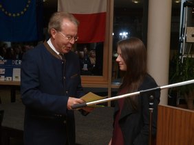 Der Begründer des Austauschprojekts Herbert Jank stellte im Anschluss in seinen Laudationes die sechs Preisträger vor. Herbert Jank und Dr. Andreas Hatzung verliehen darauf die Preise im Beisein zahlreicher Festgäste, u.a. von Pierre Wolff, dem Vorsitzenden der Montgelas-Gesellschaft. Danach hielten Magdalena Bachinger und zwei weitere Gymnasiastinnen sowie drei Schüler katholischer Realschulen ihre Dankesrede.
